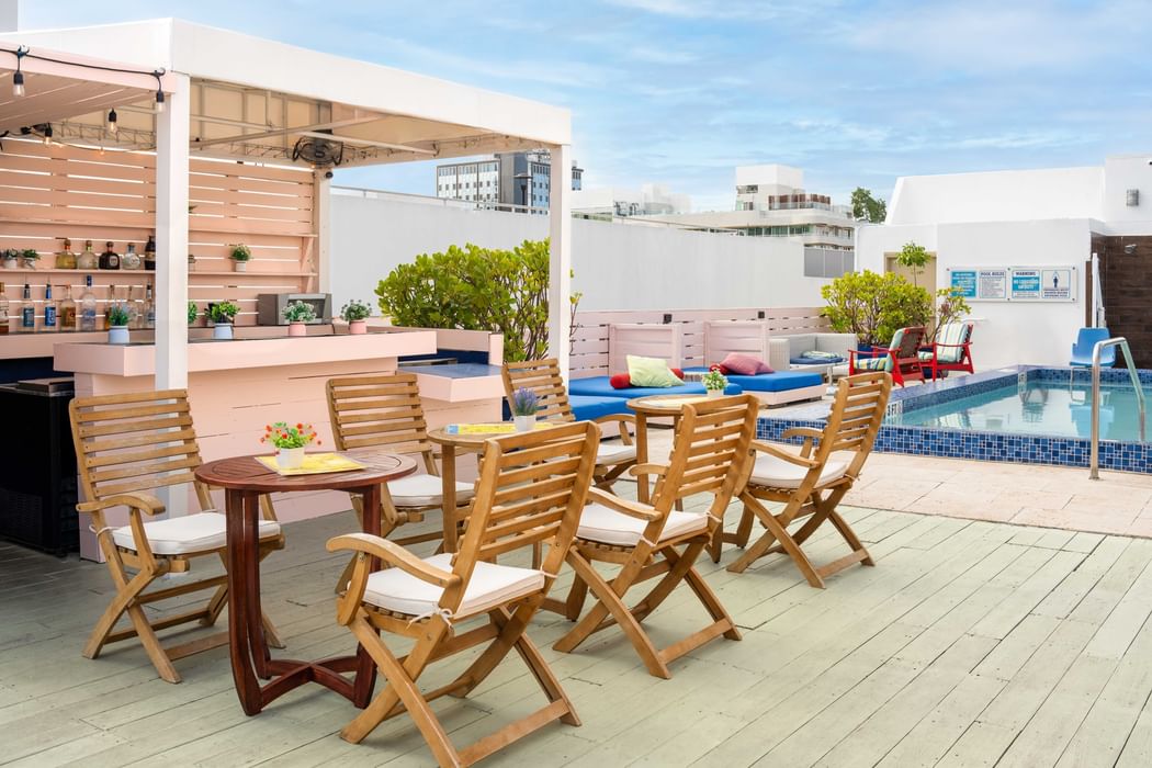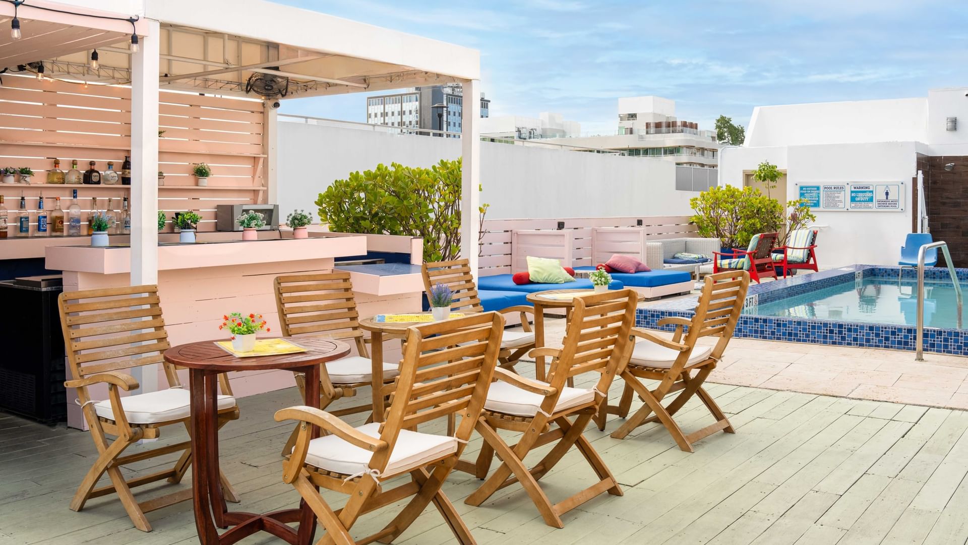 Dorset Rooftop Bar featuring wooden chairs, pink decor, and a small pool area at Catalina Hotel & Beach Club