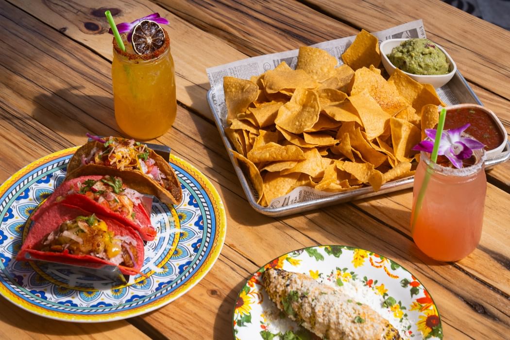 Three colorful gourmet tacos served in Taco Taco on a decorative plate with a citrus drink at Catalina Hotel & Beach Club